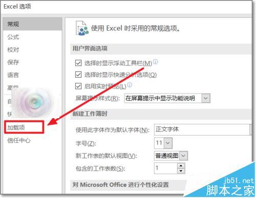 2、加载项在Excel选项中,点击“选项”进入设置。