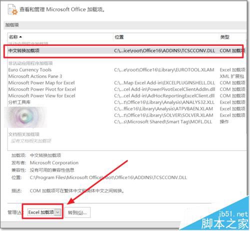 4、出现具体的加载项,可以查看活动中与非活动的加载项。Windows10中,中文转换加载项存在,若安装了翻译软件不是加载翻译软件的项目,
