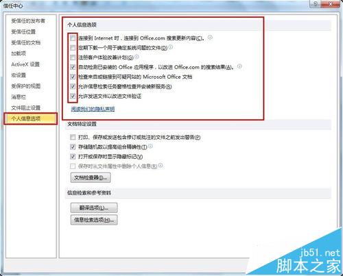 5、在“信任中心”对话框中选择“个人信息选项”,取消所有个人信息选项的对勾,如图: