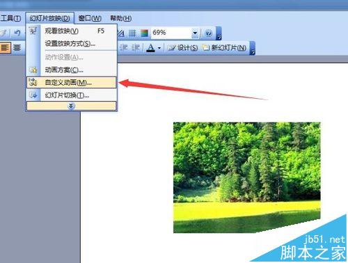 3、调整到适当大小,然后点击“幻灯片放映”,在点击“自定义动画”
