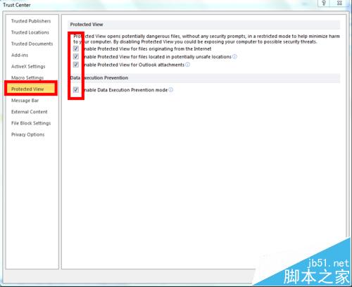 4、出现“信任中心”界面,点击“Protected View”,将右边所有的对号全部去掉,点击保存