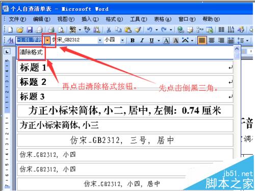 2、然后点击格式工具栏最前方的倒三角,出现一个菜单,然后单击“清除格式”按钮。