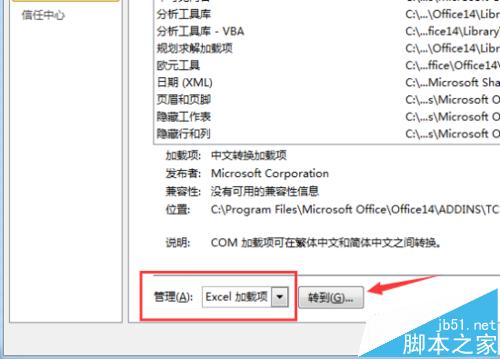 3、在“加载项”选项卡下的“管理”中点击下拉菜单选择“Excel加载项”,然后再点击“转到”按钮。如图所示;