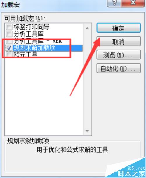 4、在转到“加载宏”的对话窗口中,勾选“规划求解加载项”,之后再点击“确定”按钮。如图所示;