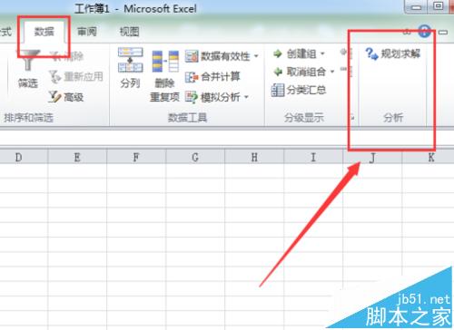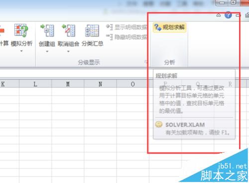 6、“规划求解加载项”添加好之后,我们可以在其所在位置如下:功能区“数据”选项卡的“分析”组中。如图所示;