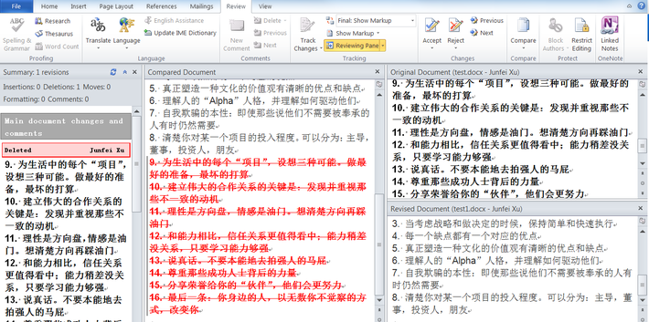 可是时间过去很久了,对方又要的急,所以就用到了“审阅”下的“比较”功能,很快的查找出了做过修改的各个细节,大大提升了工作效率。