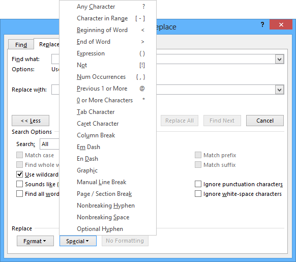 在“特殊”弹出菜单上,单击通配符,然后在“查找内容”框中键入任何附加文字