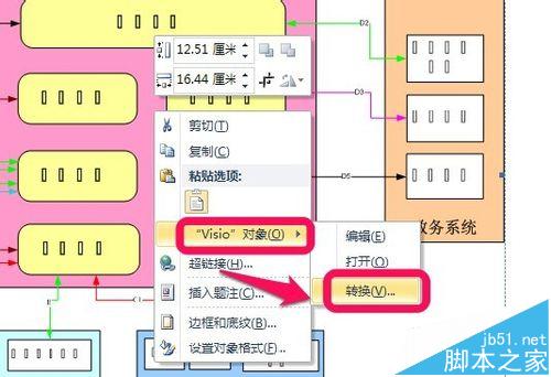 3、选择这个visio图片,右键下拉菜单——》visio对象——》转换。如图。