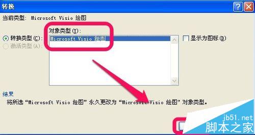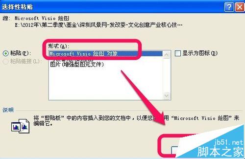 7、选择Microsoft Visio 绘图对象,确定即可。这样粘贴出来的就不会是乱码了。