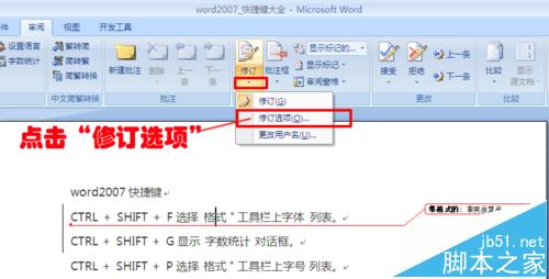 2、点击工具栏中“审阅”找到“修订”,在修订工具下方找到小箭头,并点击,出现下拉菜单,选择“修订选项”,如下图所示: