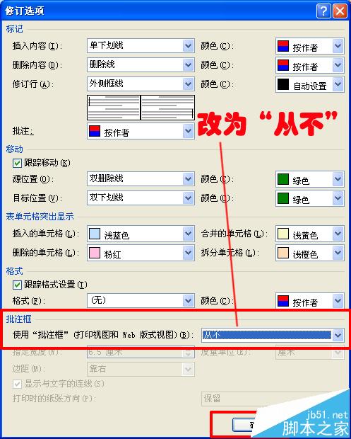 4、在“使用批注框”选项后面选择“从不”,并点击“确定”,如下图所示: