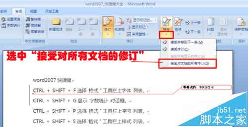 5、然后工具栏“审阅”中,找到“接受”栏,点击下方的小箭头,出现下拉菜单,选中“接受对所有文档的修订”,如下图所示: