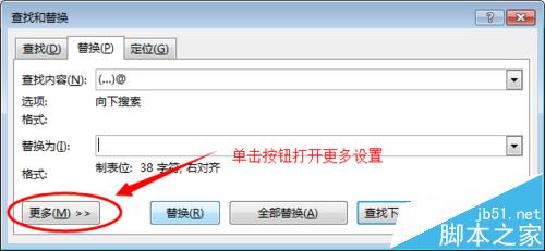 3、按快捷键Ctrl+H打开对话框【查找和替换】,鼠标点击【查找内容】文本框,输入 (...)@ ,然后鼠标点击【替换为】文本框,再单击下面的【格式】按钮。如果没有显示格式按钮,可以点击 【更多】打开。