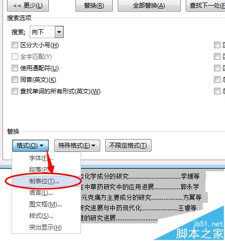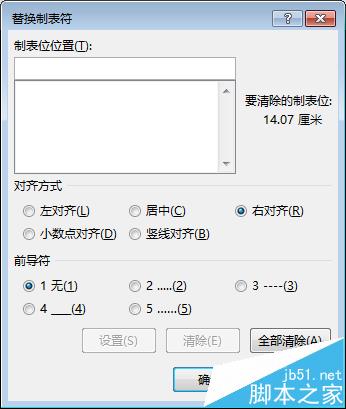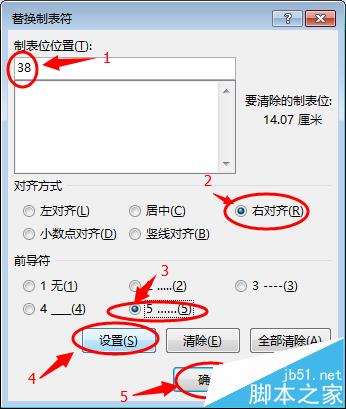 4、在【格式】下拉菜单中选择 制表位 选项,弹出替换制表符对话框,在【制表位位置】输入38(数值可以根据自己需要调整大小);【对齐方式】选择右对齐;【前导符】选择5【......】,然后单击设置按钮,并点击确定关闭对话框。