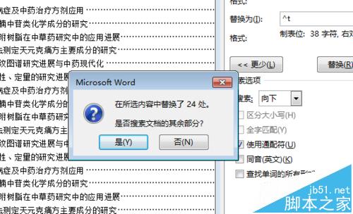 5、回到【查找和替换】窗口,在【替换为】文本框中输入 ^t ,单击下面【使用通配符】前的复选框打钩,最后单击 【全部替换】按钮。这时如果弹出对话框,询问是否替换其他位置,可以根据需要选择 是 或者 否。