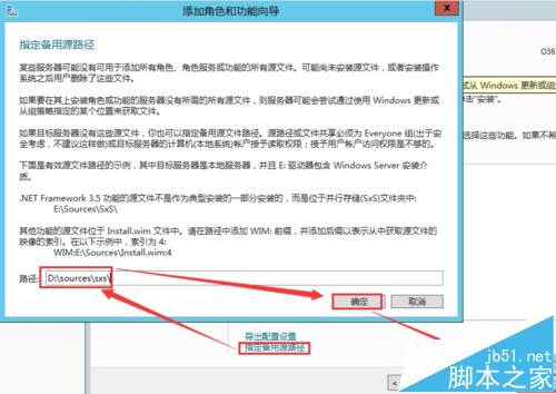 3、点击“指定备用源途径”指定体系地点途径(D:\sources\sxs\)点击“断定”---“装置”