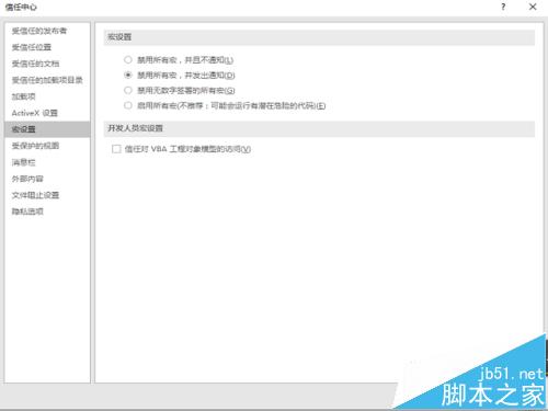 9、加载项去除后如无效,将加载项恢复原状,选择信任中心,选择宏设置,如下图所示,先将所有的宏禁用,再回到第六步进行测试,如不成功,则在activeX设置中,选择禁用所有的控件