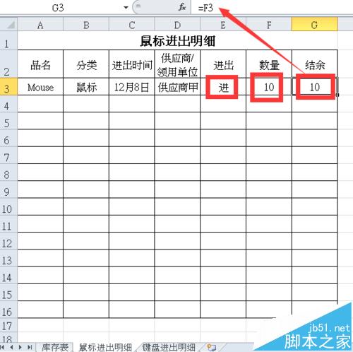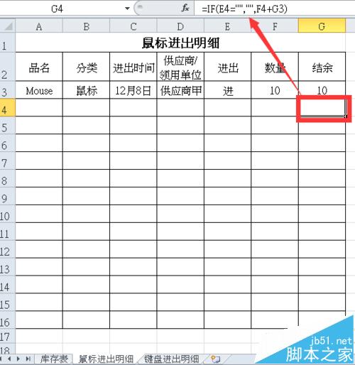7、在库存表中库存栏位输入公式:=LOOKUP(1,0/(鼠标进出明细!G2:G1001<>""),鼠标进出明细!G2:G1001)