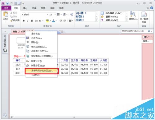 1、首先打开OneNote 2010的所要修改分区密码的页面,右键分区标题,选择“用密码保护此分区”;