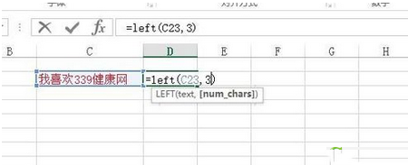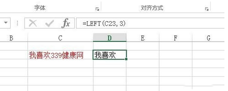 在如图所示的例子中,我们需要截图“我喜欢339健康网”前面的3个字符串,输入公式:=LEFT(C23,3)。