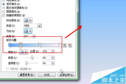 1、打开PPT,设置背景为蓝白渐变,由上到下,由蓝变白,使用线性填充,渐变光圈的位置适当调整,如图所示