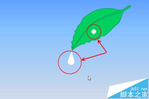 3、紧接着在叶片上面插入形状正圆,并将正圆填充颜色为白色,添加形状效果“柔滑边缘”,设置为5磅,将正圆放在叶子上面靠近脉络的位置,然后插入形状“泪滴形状”,填充白色,适当调整其大小,放在叶尖位置,如图所示