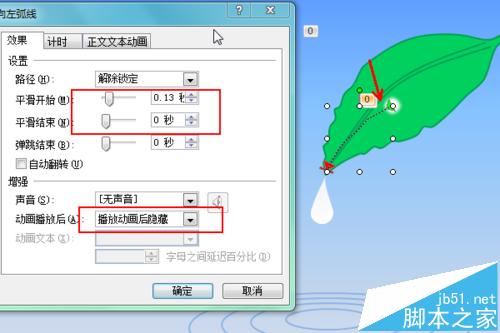 5、图形绘制完成之后,开始添加动画效果,先选中叶子和上面的露珠添加动画效果“淡出”,均设置为与上一动画同时,接着给露珠添加一个“弧线”路径,方向沿着叶子脉络向叶尖方向移动,路径的效果设置为与上一动画同时,平滑开始0.13秒,播放动画后隐藏,如图所示