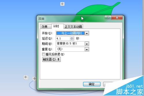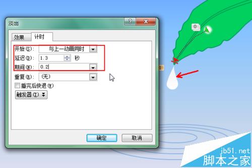 6、叶尖位置的泪滴形为露珠滚落形成,添加“淡出”效果,设置与上一动画同时,延迟1.3秒,期间0.2秒
