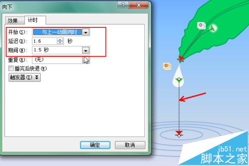 7、还是选中叶尖的露珠,添加向下的路径效果,点击“计时”,设置为“与上一动画同时”,延迟1.6秒,期间1.5秒,点击“效果”,平滑开始设置为0.6秒,设置“播放动画后隐藏”