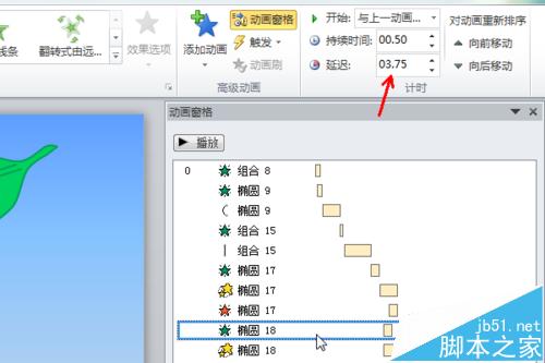 11、为所有椭圆添加相同的效果后,需要每个椭圆出现消失的时间有间隔,调整后续几个椭圆的延迟时间,在原有的基础上面一次增加0.2秒左右即可,如图所示