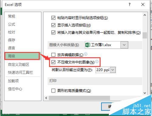 2、点击后,会弹出“Excel选项”的新窗口,在窗口左边点击“高级”,在窗口右侧滚动滚动条,并勾选“不压缩文件中的图像”。设置完成之后点击确认退出即可。