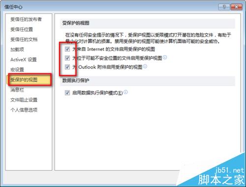 3、在弹出的窗口中,把右侧“受保护视图”下的三个勾选项取消即可。
