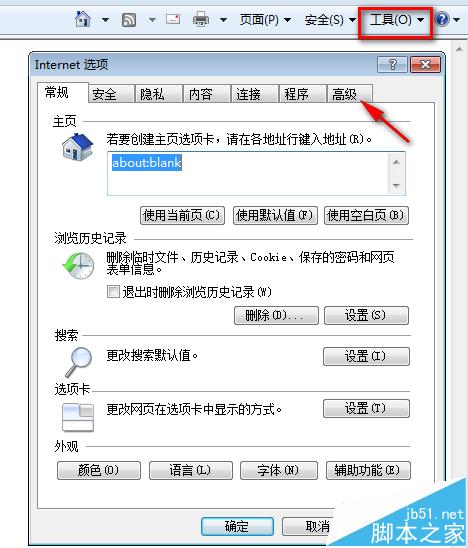 1、打开IE浏览器,点工具菜单,点Internet选项,然后选择“高级”选项卡。