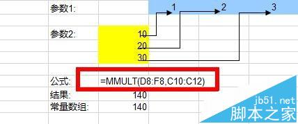 3、确认函数后,按下Enter键,即可得到如图所示的矩阵结果“140“(这里计算过程为:1*10+2*20+3*30)。