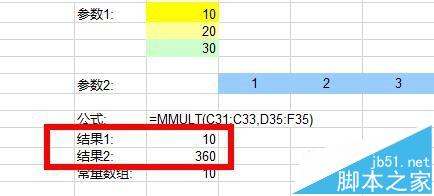 1、然后,我们计算矩阵1行n列与m行x列之积。如图所示,样例中建立了参数1(1行3列)和参数2(3行2列)。