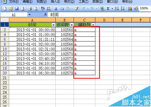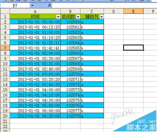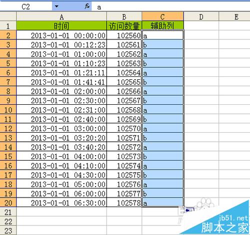 2、在前两行的辅助列上,输入a,b,当然了,这里可以随意输入,只要是区分开即可。