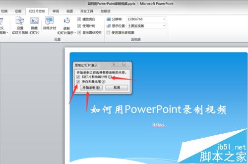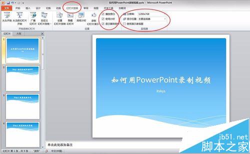 3、点击“幻灯片放映”菜单,进行参数设置,设置方法如下图。为了保证视频的清晰度,分辨率一般设置为1280*768或更大;把播放旁白选中。