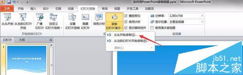 4、确保电脑上已插入耳麦,然后在“幻灯片放映”菜单中,点击“录制幻灯片演示”选择“从开始录制”。如果没有插入耳麦,则需要把PPT关闭,插好后再打开。