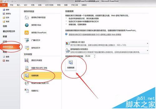 9、确认没有问题后,点击“文件”,选择“保存并发送”,创建视频,并点击右侧的“创建视频”按钮。