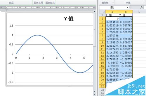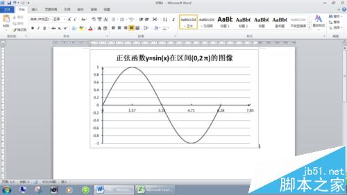 4、关闭EXCEL窗口。在WORD中已经绘出了正弦函数在第一周期的函数图形。若需要按数学图形的要求,还需要作些局部修改。先双击标题”Y值“,修改为函数标题如图。
