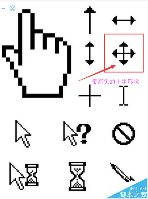 5、带箭头的十字形状 通常出现在图形处理过程中。可以用来帮助用户精确地定位,可移动图形到指定的位置。