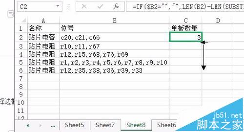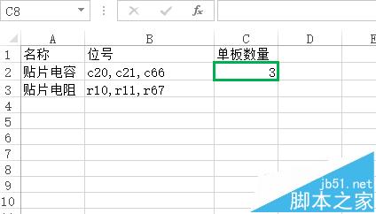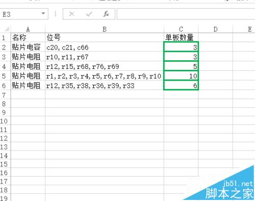 2、以下面这个表格为例,得出表格中电阻货或电容的数量。