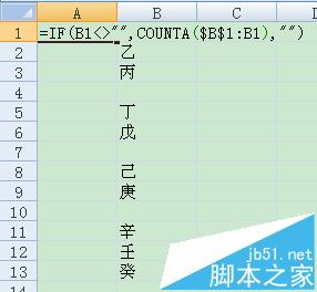 2、这种情况可以用函数,实现跳行输连续序号。在A1栏输入=IF(B1<>"",COUNTA($B$1:B1),""),然后确定,此时A列显示为1。