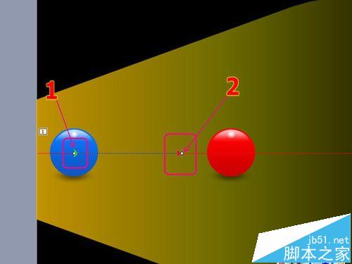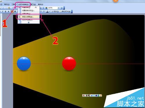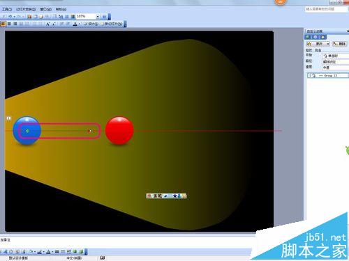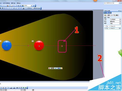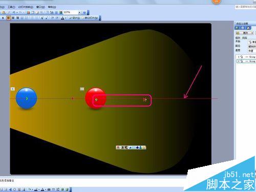 1、新建一个PPT文档。在文档中放置两个小球,设置必要的背景效果等等。