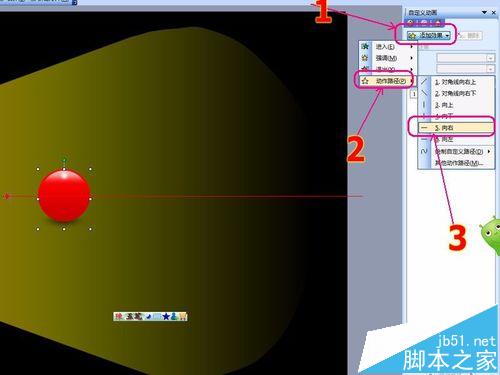 1、添加蓝色小球的动画。选中小球,选择“自定义动画”工具栏的中的“添加动画”,选择“动作路径”,选择“向右”。小球自动添加一个向右的箭头,标志向右的动作。