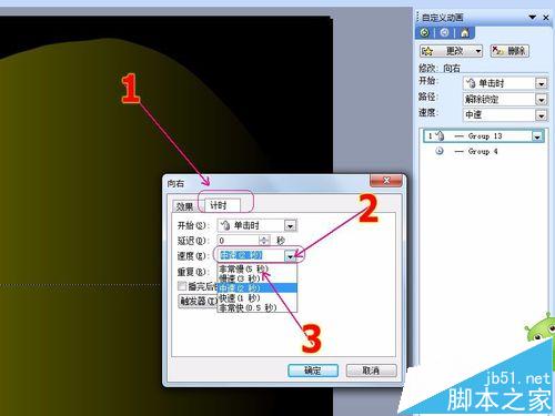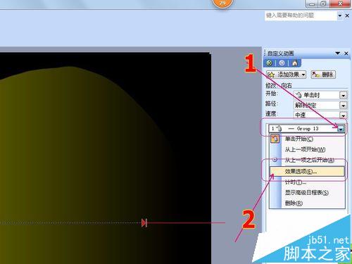 1)选择动画工具栏中的动作1,选择右面的向下的“三角”,选择效果。然后出现效果选项对话框。