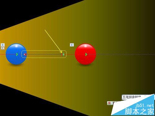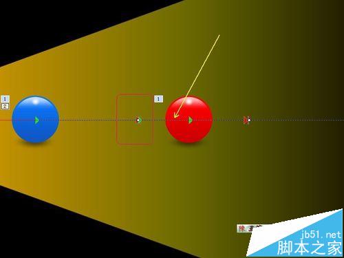 2)选择路径后,路径的终点(红色的箭头后面)出现个白色的小圈,鼠标指向小圈,向左或向右托动,调整路径的长度,然后播放,使用蓝色的小球停止时,刚好与红色的小球紧靠在一起。尽量多操作几次,使两个小球紧挨在一起。