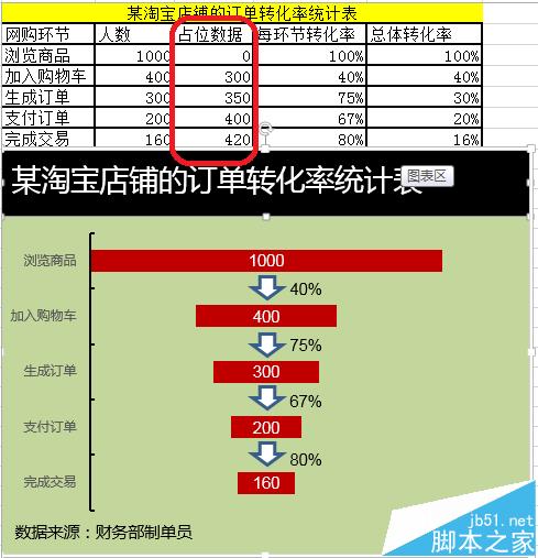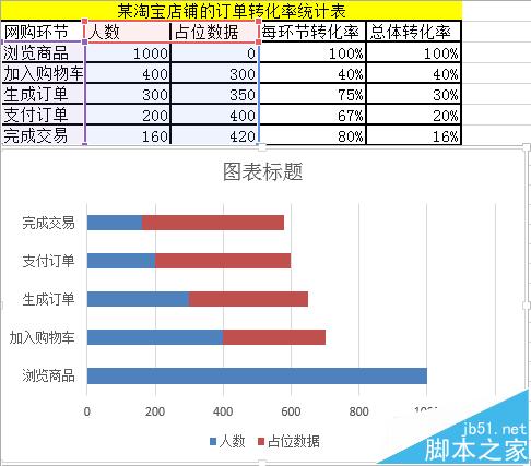 1、数据准备,如图所示,添加如图的占位数据。由于加入购物车——400放到中间,所以占位数据(1000-400)/2=300。由于生成订单——300放到中间,所以占位数据(1000-300)/2=350。