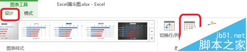 3、如图所示,点击图表工具——设计——选择数据。点击如图的箭头——把占位数据调上来。