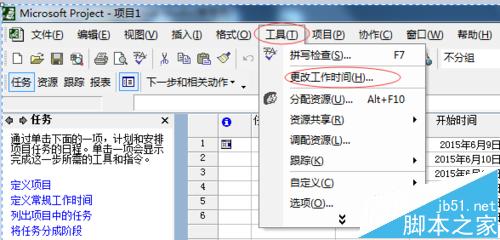 3、新建一个项目,在上方的菜单栏中找到“工具”,点击“工具”,在出来的下拉框中点击“更改工作时间”,如下图中标红的框。